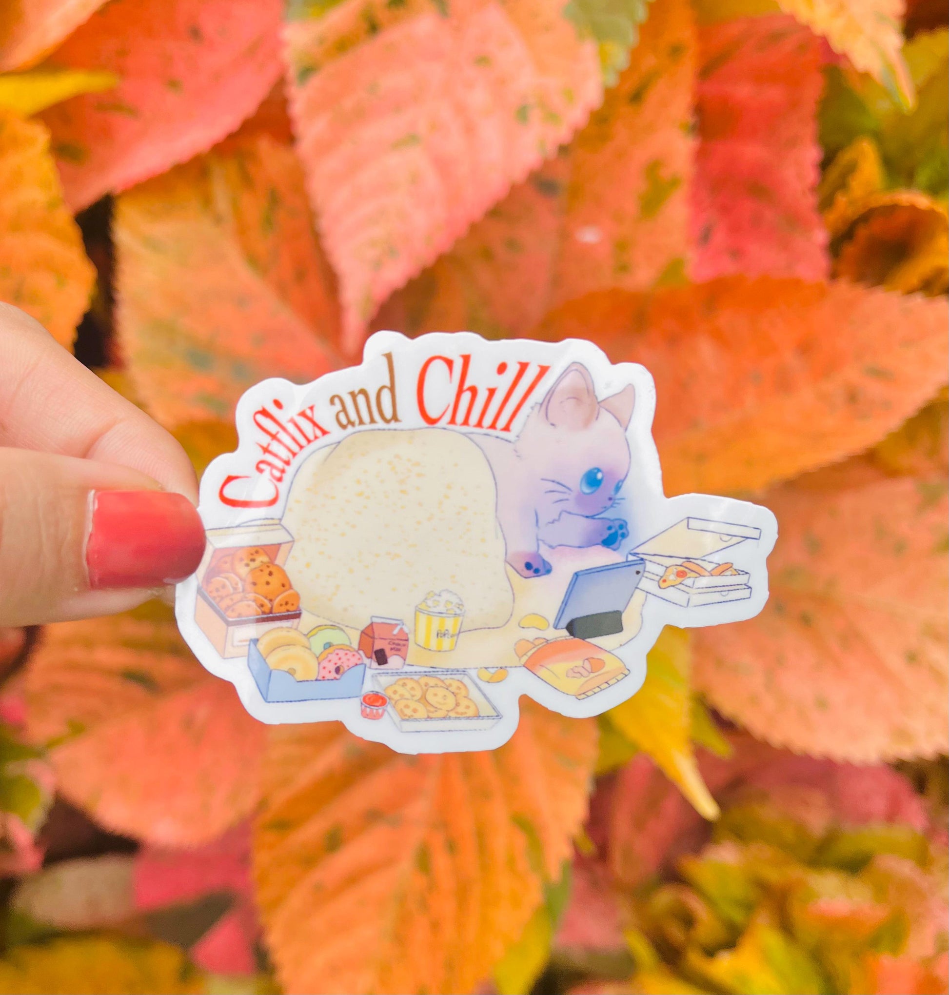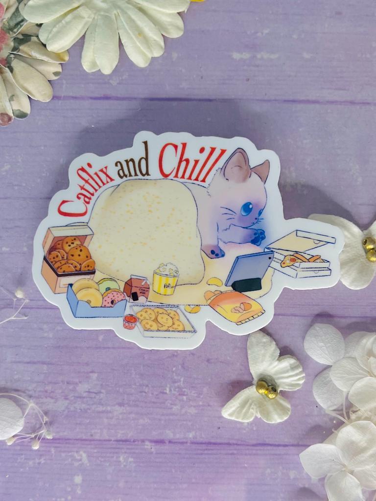 Cute Cat Sticker 3 Inch Vinyl | Catflix and Chill Funny Kawaii Cat Lover Gift | Laptop Sticker, Water Bottle Sticker, Journaling Sticker