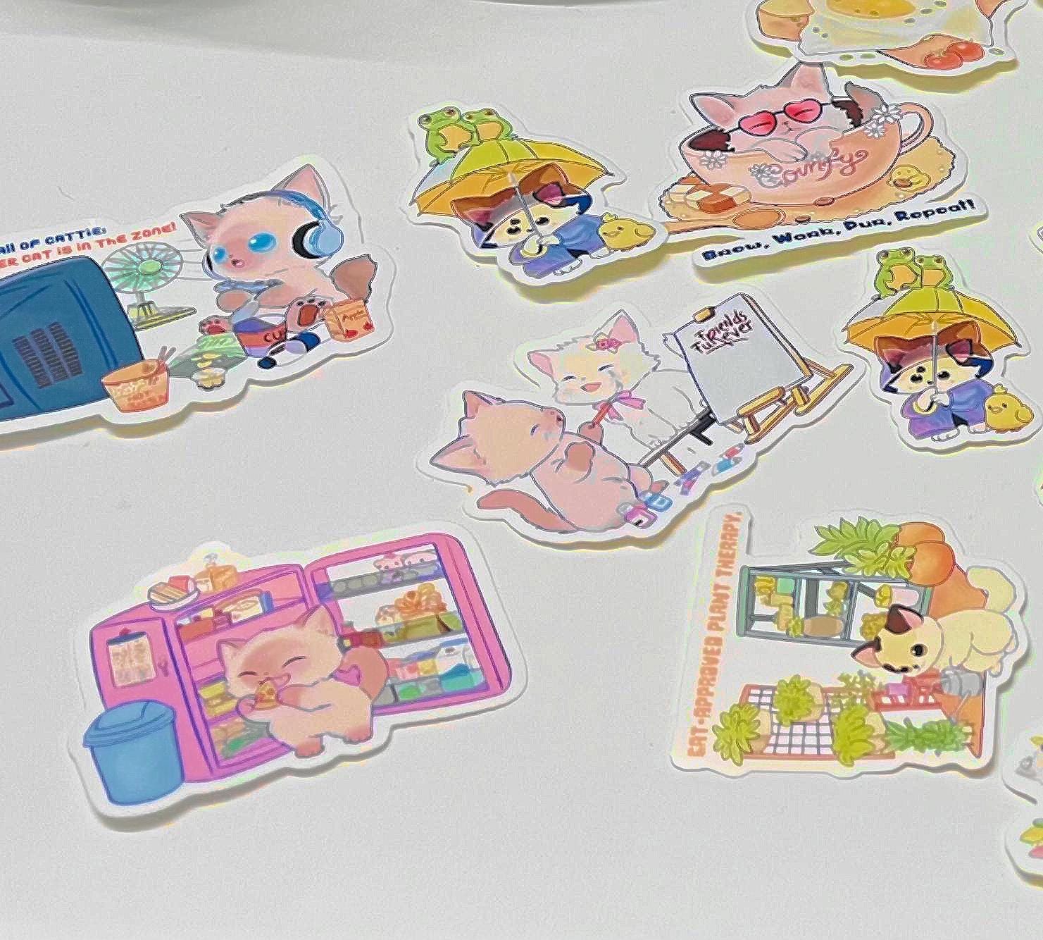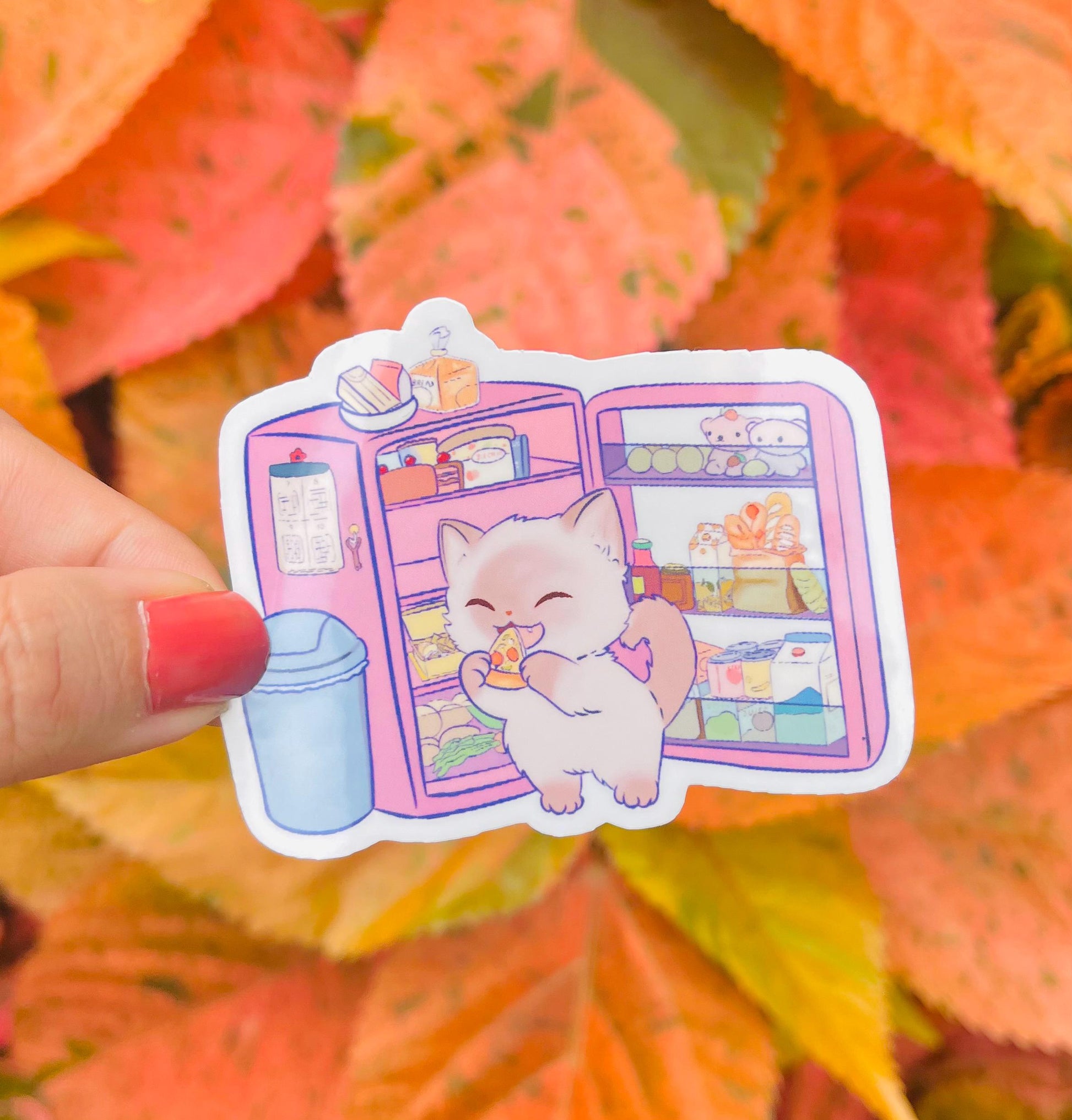 Caught mid-snack with a slice of pizza in paw, this vinyl sticker captures the pure joy of late-night cravings. From stacked desserts to secret snacks, the whole fridge is a dream. Perfect for anyone who loves food and cats (aka everyone?).