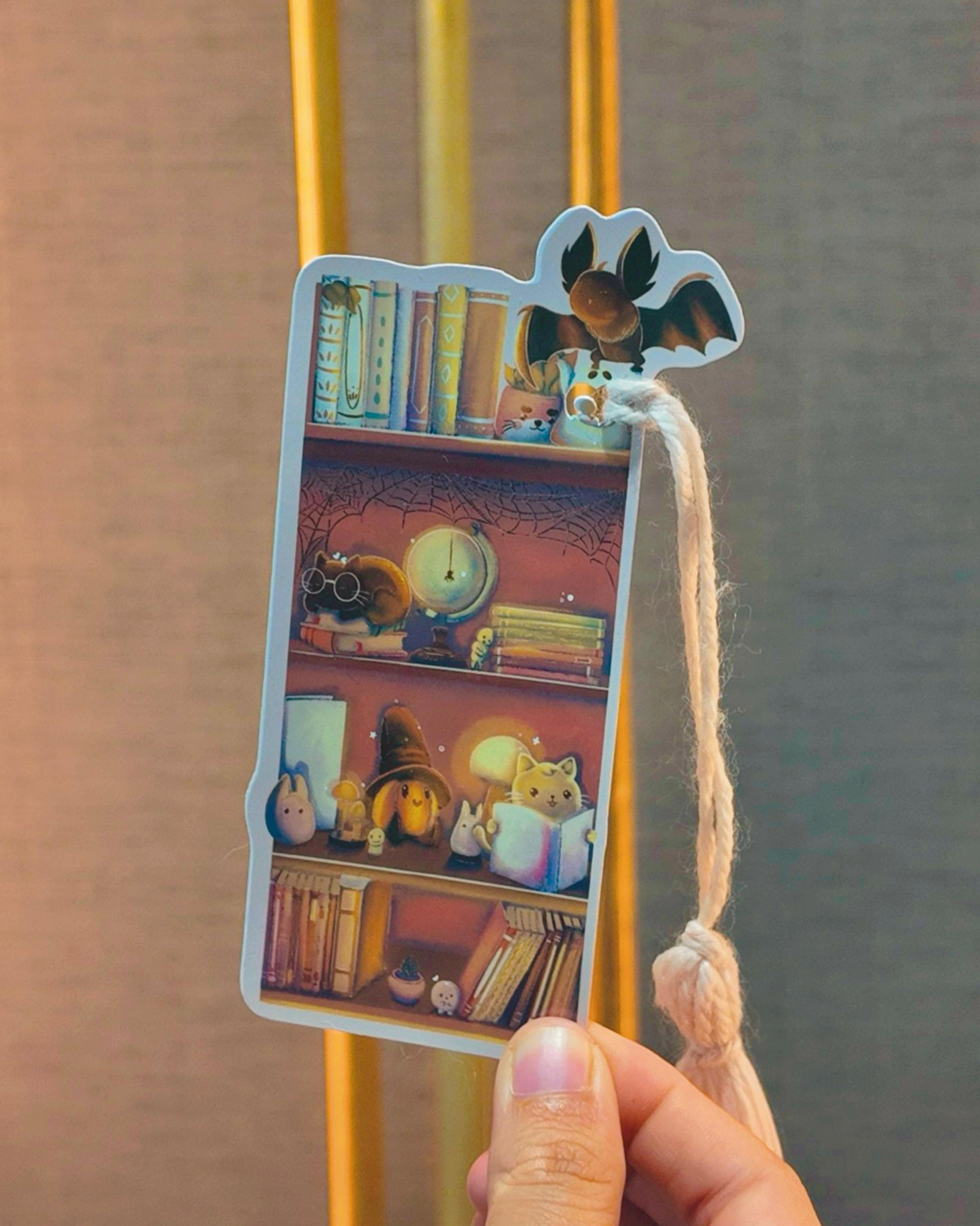 Add a touch of whimsical Halloween charm to your reading with this handmade bookshelf bookmark! Featuring a magical shelf with books, a curious black cat, tiny bat, lamps, plants, and a spider web, it’s perfect for spooky, fantasy, or gothic lovers.