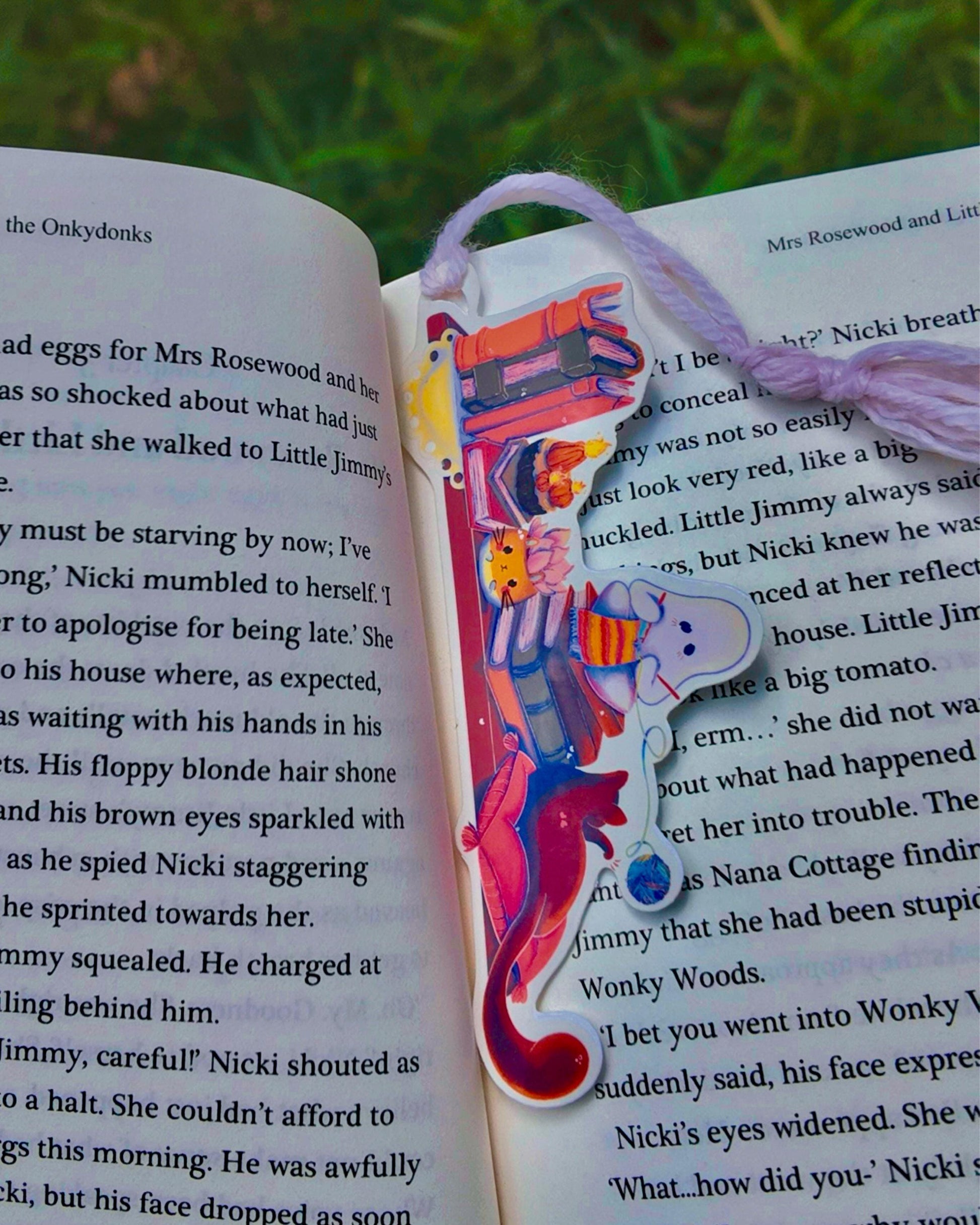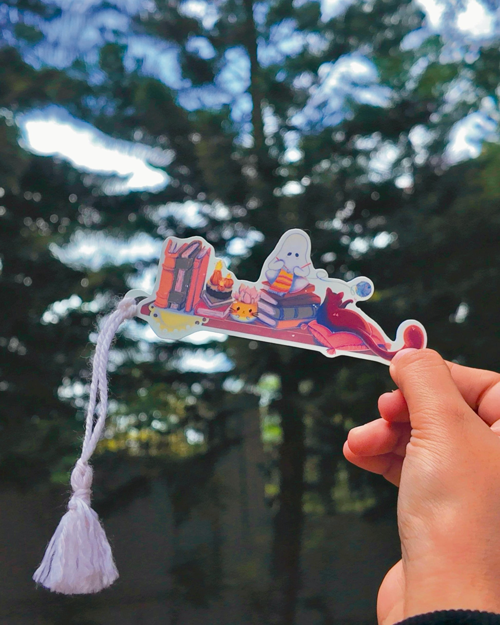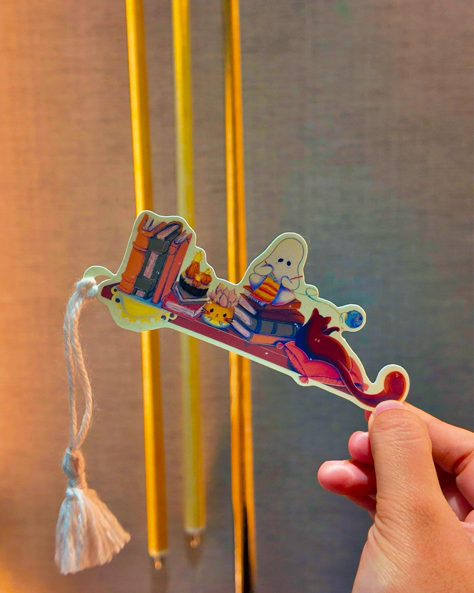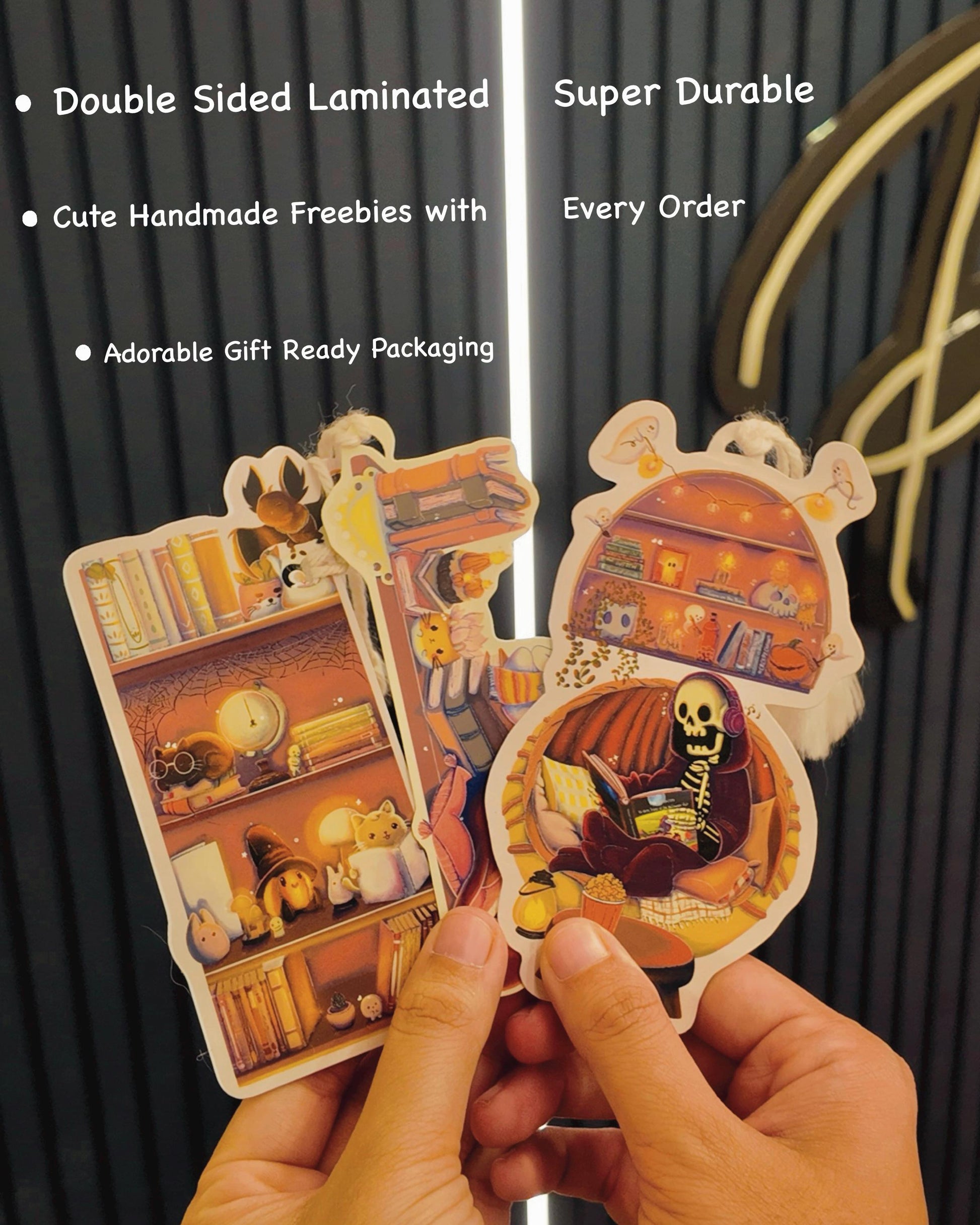 Add a touch of cozy spookiness to your reading time with this whimsical Halloween bookshelf bookmark.